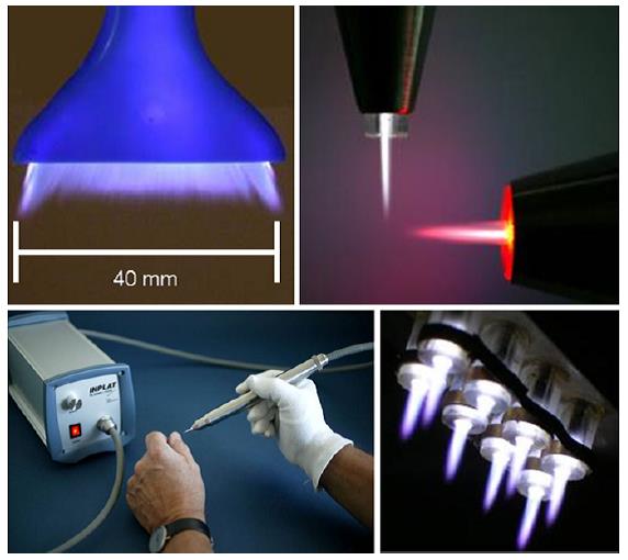Hình 2 – Các thiết kế khác nhau của APPJ điều khiển bởi RF: luồng plasma rộng (trên trái); APPJs tạo luồng plasma nhỏ (trên phải); thiết bị cầm tay INPLAT (dưới trái) và một thiết bị gồm sáu luồng APPJs(dưới phải).